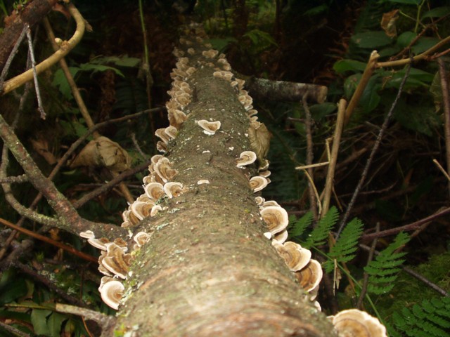 Description: Usually many overlapping caps attached to dead wood. Fan-shaped caps have multi-coloured zones and a leathery texture. Whitish pores underneath.