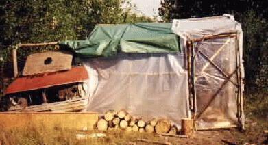 made of tarps and birch-branch frames. The biggest problem was staying warm and